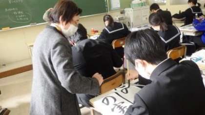 講師の方には、机を回って個別に筆遣いを指導していただきました。講師の方から、指導の後で、「3年生がとても落ち着いて、集中して取り組んでいる姿に感心しました」とほめていただきました。