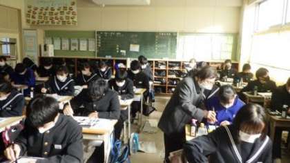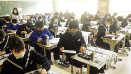 12月13日(月)は、豊田市書道連盟の会員の方を講師にお迎えして、3年生が毛筆でで「理想の実現」書写の練習に取り組みました。指導いただける時間の都合等により、本校では、3年生のみが受講します。