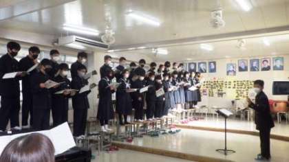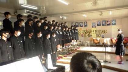 どのクラスも、表現力豊かな指揮やピアノ伴奏に導かれて、歌詞の意味をかみしめて、仲間と心を一つにして、優しい声で歌い上げていました。発表の後、代表生徒が「一生、心に残る思い出になりました」と語る姿も見られました。