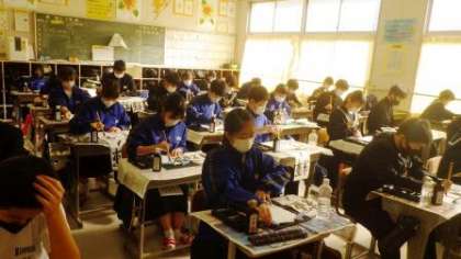 2年生の課題は、「輝く生命」です。伸び伸びとした筆遣いで取り組む姿が見られました。