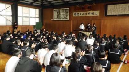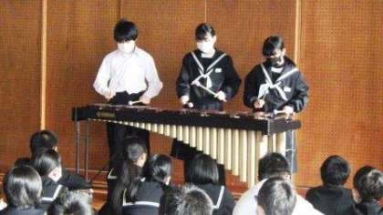 1月7日(金)には、2年生の学年集会で、演奏の披露を行いました。今年度は、文化祭を開催することができませんが、それに代えて、生徒の活動の成果を、多様な形で披露する機会をもつように努めています。息の合った迫力ある演奏に、盛大な拍手が送られていました。