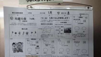 松平の七草給食 公開日 2022/01/07 更新日 2022/01/07 お知らせ 1月7日(金)の給食は、「七草ご飯」でした。七草が松平の特産物であることは、冬休み中にもテレビや新聞でも、たびたび報道されていました。給食センターから配付される献立表にも「松平の七草」が紹介されていました。 七草が、ほどよい塩味で味付けされものを、ご飯に混ぜて、おいしくいただきました。