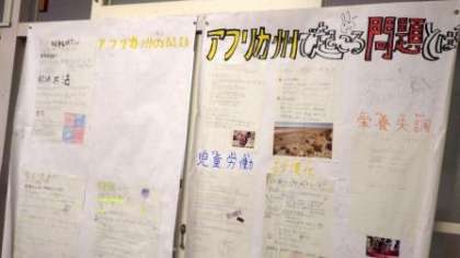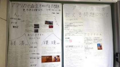 それぞれの生徒が関心をもった、アフリカの現状や課題について追究した成果を掲示物にまとめました。現在は、1年生教室隣の学習室に展示しています。
