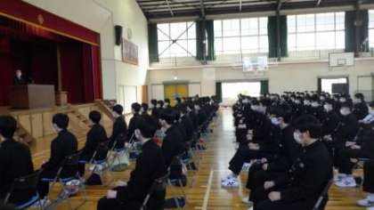 松平親氏公顕彰会より、会長様はじめ2名の代表者様にお越しいただき、「親氏賞」の表彰をしていただきました。この賞は、松平地区の伝統を引き継ぎながら、本校の模範となる生徒に贈られる賞です。今年度は、松平わ太鼓の継承発展に継続して取り組んでいる生徒に贈られました。会長様には、授与に続いて、賞の由来や卒業生へのはなむけのお話をしていただきました。