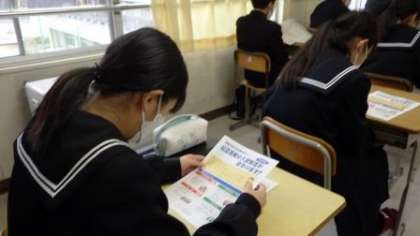愛知県教育委員会から届いたパンフレットを配付し、進路指導主事がそれぞれの学級で説明をしました。真剣な表情で聞き入る姿が見られました。