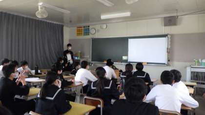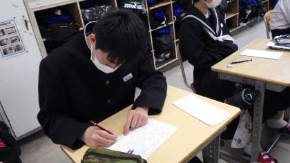 3月22日の5時間目に2年生が立志式を行いました。これまでの学校生活を振り返り、お世話になった方に感謝するとともに、最終学年に向けて誓いや目標を立てるという目的があります。生徒達は映像を見て、こども園時代や小学生時代からの思い出を振り返りました。最後には1年後の自分に対して手紙を書き、最終学年に向けて目標を立てました。