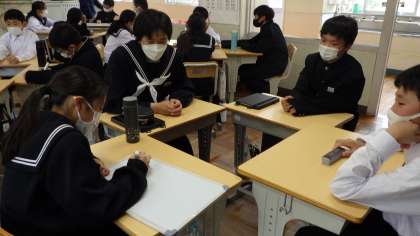 4月19日、新年度になって初めての総合の授業が行われました。1年生では「松平地区について知っていること」を話し合いました。2年生では、1つのテーマ(「みんなにとって良い学校とは?」)について意見を出し合い共有しあう「ワールドカフェ」という話し合い活動が行われました。3年生では修学旅行に向けて、東京について調べ学習を行っていました。新型ウイルス感染防止に配慮し、距離をとりながらも、生徒たちは話し合いに熱中している様子でした。