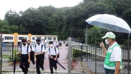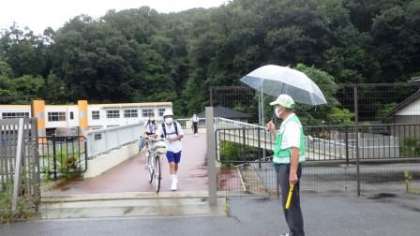 登校にあたり、地域の民生児童委員さんが各学校に分かれて、校門等で挨拶をしてくださいました。本校でも、雨模様の中、民生児童委員さんが歩道橋そばに立ち、登校する生徒たち一人一人の顔を見て、「おはようございます」と声をかけてくださいました。生徒たちもはにかみながら挨拶を返していました。