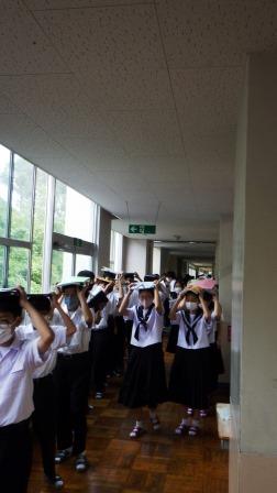 訓練放送により、生徒たちは机の下など、各自が身近な危険の少ない場所で、頭を守って姿勢を低くするなどの、第一次避難行動をとりました。