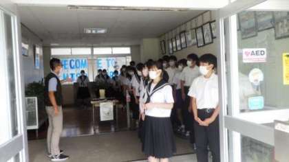 今回は、前回の振り返りをもとに、よりスムーズに避難できるよう、避難経路を見直しました。これまでの避難経路は校舎外に最短で出ることができるものの、全校生徒が使うとなると渋滞を招くことになります。そこで、避難経路として使える階段や出口を細かく分散して行いました。日頃は使用しない職員玄関も使うことにしました。