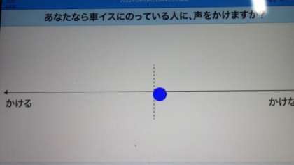 NHK for schoolの「声をかければよかったのに」を資料として活用しました。車いすを利用している人が、困っている様子の場面で、声をかけるかどうかを、自分の気持ちをタブレットのポジショニングの機能を使って表しました。どうしてそう思うか、また、声をかけるならどのようにかけるかを考え、話し合いました。「断られたらどうしょう」、「まず、『お困りですか・お手伝いしましょうか」と聞いてみたらどうか」などの意見がだされました。そして、「たとえ申し出を断られても、相手はいや気持ちにはならないのではないか」など、相手の立場にたって考えることの意義に気づくことができました。