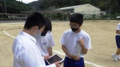 走る姿勢やバトンパスの様子を学習用タブレットで撮影して、後で見合って、よいところや課題を話し合う姿が見られました。また、タブレットのストップウオッチ機能を使って、走るタイムを計測して、記録の伸びを確認していました。