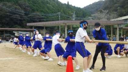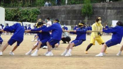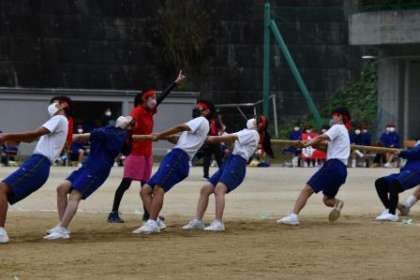 プログラム第2回「綱引き」の様子です。 各クラスを代表する選手が出場し、力の限り引き合いました。
