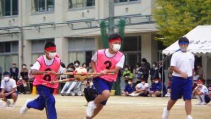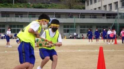 昨年は新聞紙の両端を持ってボールを載せて運びましたが、今年度は、より安定するように剣道のシナイを使って運ぶように変更して実施しました。勢いあまってボールを落とさないよう、2人が息を合わせて疾走しました。
