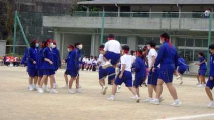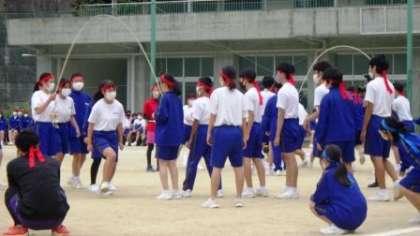 体育祭6 大繩跳び 公開日 2022/10/22 更新日 2022/10/22 お知らせ プログラム第5回「大縄跳び(8の字跳び)」の様子です。感染対策を講じ、昨年度より全員で一斉に跳ぶ方法から、1学級を2つのグループに分けて2本ずつの大縄を使い、一人ずつ縄に入る「8の字跳び」に変更して実施しました。たとえ引っかかっても、中断しても、輪の中に入った人数が累計されるルールとしました。一人一人の頑張りを積み重ねて、各学級がそれぞれの最高記録に挑戦しました。