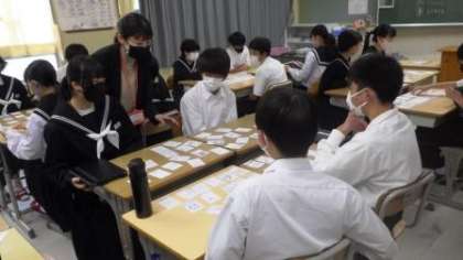 1年3組は、国語科「今に生きる言葉」の単元で、故事成語かるたを自作し、班でかるた取りを行い、意味をたくさん覚えました。
