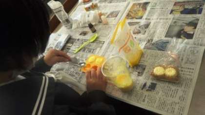 入浴剤を作る生徒は、材料を混ぜて、型の中に入れていました。時間が経つといくらか膨らむために、入れる量が多いとあふれてしまいます。「スプーン5杯がちょうどよい形になる」などと、相談ながら工夫して作っていました。