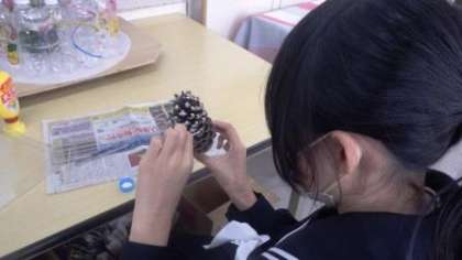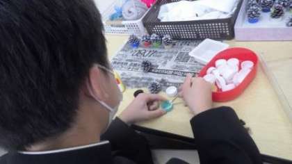 松ぼっくりツリーを作る生徒は、ビーズを付ける作業と、土台となるペットボトルキャップに載せる作業を、流れ作業で分担して手際よく仕上げていました。