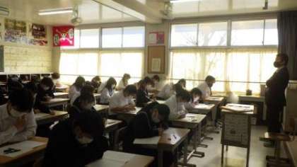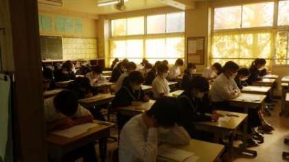 今回は、後期中間テストとして1・2年生は5教科を11月17日(木)〜18日(金)の2日間に分けて実施します。3年生は、それに加えて16日に技能教科の単元テストを行いました。生徒たちは、事前に、担任から黒板に掲示された留意点等を見て、受検の仕方について確認しました。1時間目は自習にして、直前の勉強時間を確保し、2時間目から4時間目でテストを行いました。