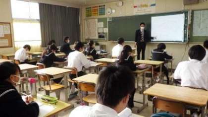 3年3組は、少人数指導による数学科です。1クラスを2つの教室に分けて、2人の教師がそれぞれ同じ内容で授業を行いました。相似な立体の表面積と体積の比について考えました。
