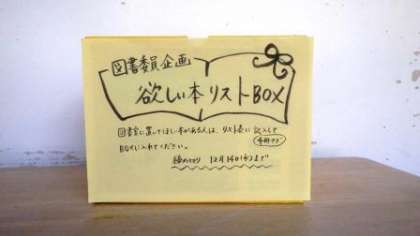 図書館に蔵書として購入してほしい本を募集する「ほしい本リクエスト」の企画では、アンケート用紙にほしい本を記載してボックスに入れるようにしています。また、各クラスの図書館の本を貸し出し冊数を記録して、多くの人に借りてもらうように呼びかけます。