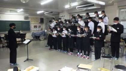 音楽発表会1年1組 公開日 2022/12/21 更新日 2022/12/21 お知らせ 音楽科の学習の成果を生かし、冬休み前の12月20日(火)から23日(金)に各学級がそれぞれの授業時間の中で、発表会を行っています。 12月21日(水)の3時間目には、1年1組が曲目「マイバラード」の合唱を発表しました。