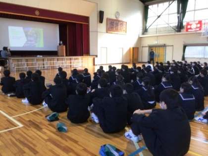 12月23日(金)は、冬休みを前に、学年集会を行い、これまでの表彰の披露や、学年リーダー会の企画、生徒代表や担当教師の話などがありました。3年生は以前の海外派遣事業にかわる「豊田を知り、世界を知ろう!国際理解推進セミナー」に参加した生徒の英語による活動紹介がありました。
