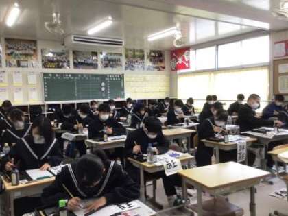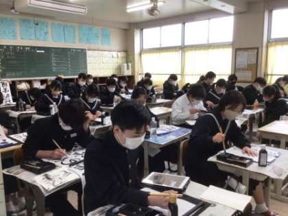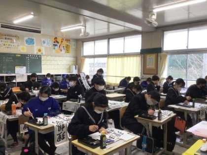 3年生の課題は、「理想の実現」です。画数の多い字を、一画一画のバランスを取りなが筆を走らせる姿が見られました。
