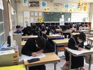 3年生は、マークシート形式の問題に慣れるよう、問題集を購入し、授業の中で取り組んでいます。
