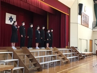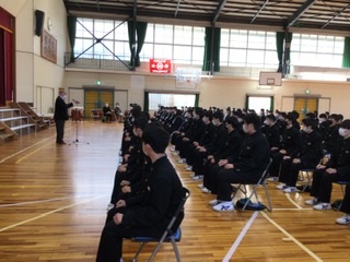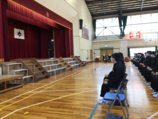 同窓会入会式 公開日 2023/03/03 更新日 2023/03/03 お知らせ 3月3日(金)、同窓会入会式を行いました。3名の同窓会役員の方にご臨席を賜りました。会長様から歓迎と励ましのお言葉をいただきました。新入会員代表が決意の言葉を述べ、最後に、地区代表生徒を紹介しました。