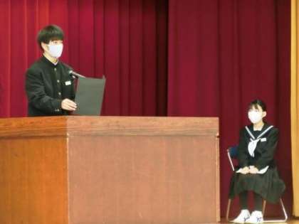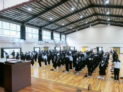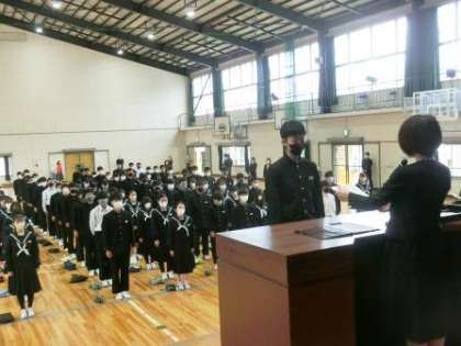 令和4年度修了式 公開日 2023/03/27 更新日 2023/03/27 お知らせ 3月24日(金)令和4年度修了式を行いました。 各学年の代表生徒が修了証を受け取りました。 また2名の生徒が各学年を代表して、今年を振り返り、次年度に向けての決意を述べました。 地域、保護者のみなさまには、令和4年度の本校の教育活動にご理解、ご協力をいただき、感謝いたします。おかげで、生徒たちは、それぞれ精一杯活動し、一回り成長することができました。
