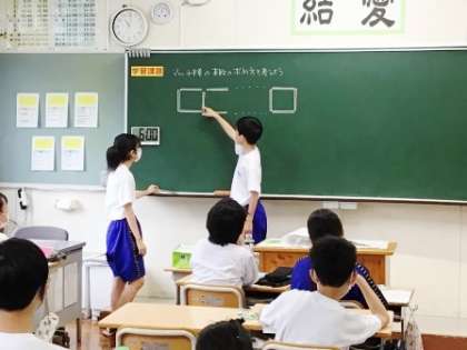 数学科では、「マッチ棒の本数の求め方を考えよう」を課題に、1〜4個や10個の場合の正方形を形作るマッチ棒の数を式に表した後、文字を使って表し、自分の言葉で伝え合いました。