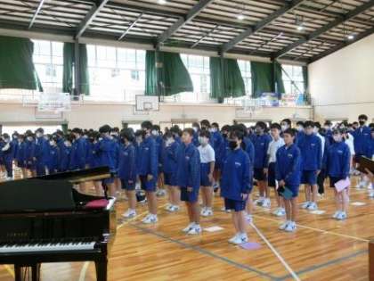 前期終業2 公開日 2023/10/06 更新日 2023/10/06 お知らせ 終業式では、生徒指導主事が、映像を交えて学校生活における人とのかかわり方についての願いを語りました。最後に、校歌を全校で合唱しました。 学級活動では、担任から通知表を受け取り、前期の頑張りを振り返る姿が見られました。 本校教育活動への保護者・地域のみなさまのご支援のおかげで、子どもたちが笑顔で学校生活を送ることができ、大きく成長できました。