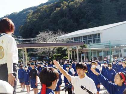 今年のテーマは「Step I DO ME(いどめ) 新たな自分を」です。3学年が協力し、3つの団が競い合って、知恵を出し合い、最善を尽くしてきました。縦割り団の活動では、3年生が団員に「松中ソーラン」を教え、お手本を示しました。1年・2年生は、それに応えようと意気込んで練習を重ねてきました。