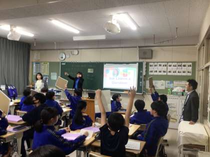 英語科では、定期的に教科担任とともに、ALT(assistant language teacher)が授業を行う時間があります。本校では、4月22日(月)から1週間、ALTの先生がどの学級にも1回は入るように授業を行っています。英語で先生に質問したり、友達と会話をしたりする姿が見られました。