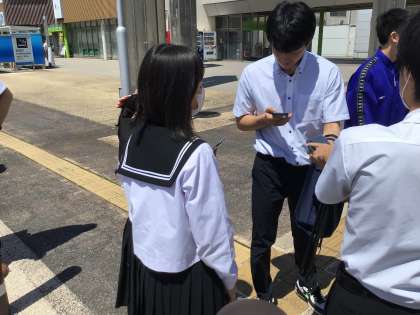 足柄サービスエリアでは、東京都内での班別研修に備えて、GPS付のスマートフォンとデジタルカメラを班長が受け取って操作を確認しました。