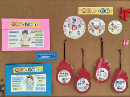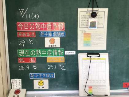 全校連絡掲示板には、その日のWBGTの状況が示されています。また、保健室前の掲示板には、注意喚起や対応についてのお知らせが示されています。