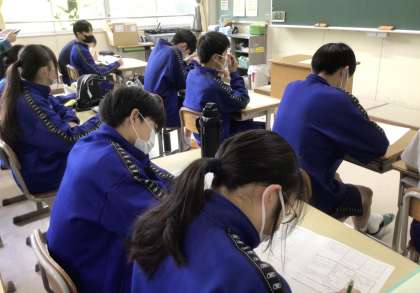 前期、後期の区切りとなる今回は、毎月のアンケート項目に加えて、より詳しく気持ちや困りごとを伝えられるような質問項目を増やして実施しました。生徒たちは、それぞれ静かに記入する姿が見られました。記入後は、A3の用紙を二つ折りにして、担任に直接手渡すようにしました。