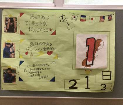 10月18日(金)、3年生の掲示板に飾られた体育祭までのカウントダウンカレンダーが、「体育祭まで、あと1日」となりました。いよいよ体育祭本番を迎えます。団長をはじめ、生徒たちはやる気に満ちています。