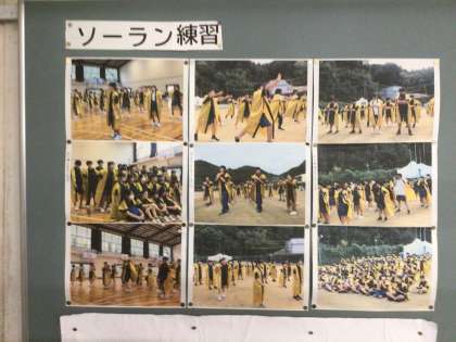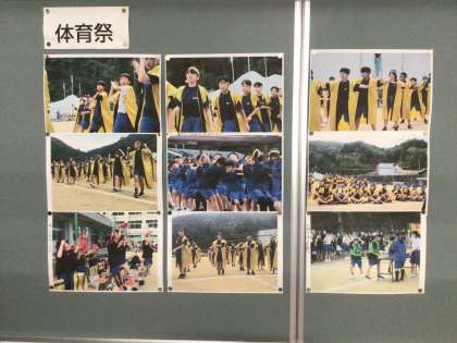 体育祭が終わり、学年掲示板に写真が掲示されています。 掲載した写真は1年生の掲示板の様子です。