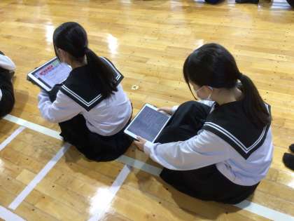 事前にタブレットに配信された進路通信を使って、今後の進路の予定について進路指導主事が説明しました。