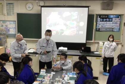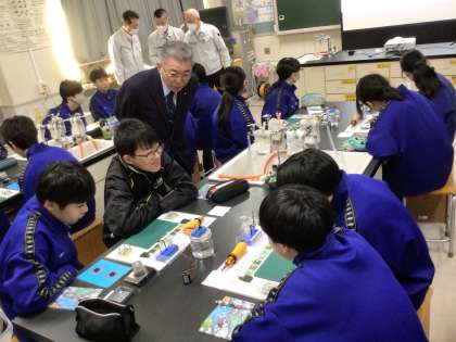 授業では、はじめに地球環境問題や車の二酸化炭素低減の取組についての説明を聞きました。その後、各班に用意していただいた実験道具を使って、興味津々な表情で、燃費電池のしくみを体験しました。