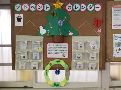 健康的な生活を願って、保健室の前には、アドベントカレンダーが掲示されています。