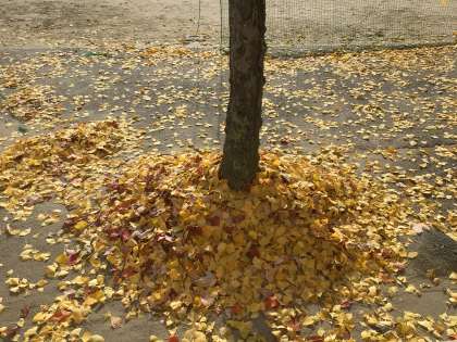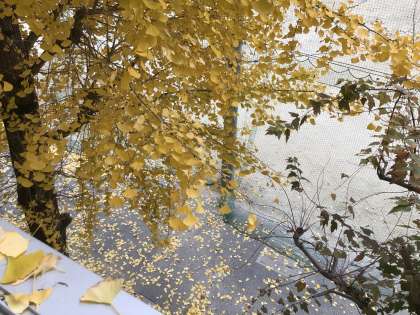 校庭のイチョウの木が金色に輝いています。