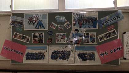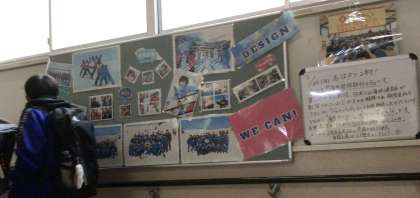2年生の自然教室の写真が学年掲示板を飾りました。 登校する生徒が足を止めて、見入る姿がありました。