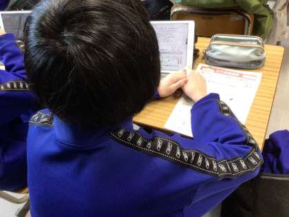 まず、保健委員が説明をしました。次にタブレットで配信した記入例を見て、紙で印刷して配付した用紙を使って、自分なりのルールを考えました。その後、家庭に持ち帰って決定します。用紙は27日(月)までに提出します。