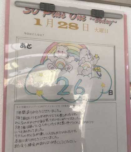 カウントダウン 公開日 2025/01/29 更新日 2025/01/29 お知らせ 3年生の卒業が近づいています。 教室には、生徒が1日ずつ担当して制作したカウントダウンカレンダーが掲示されていました。 添えられたメッセージから級友への想いが伝わってきました。