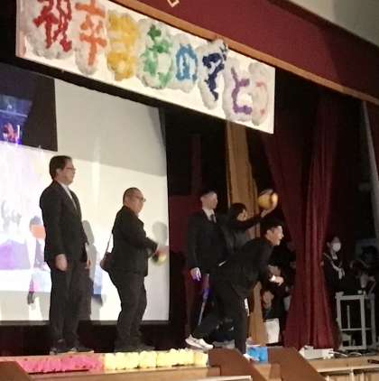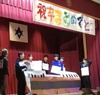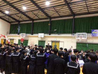 3年間の写真などで飾られた体育館で、劇や動画、クイズで思い出を振り返り、楽しい時を過ごしました。最後に、吹奏楽部の演奏にのって花道を通って送り、名残を惜しみました。
