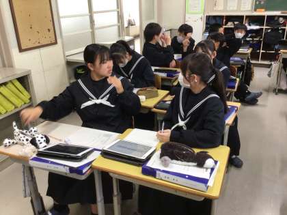 2年生は、働くことについて考えたり理解を深めたりすることで、自己の将来について考える学習を行っています。現在は、職場体験学習に向け、希望する職種について学習用タブレットを使って調べたり、仲間と情報交換をしながら事業所を探したりしました。