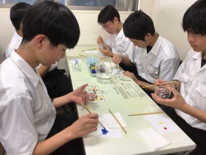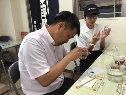 江戸風鈴絵付け体験の様子です。「むずい」という声が聞こえてきます。先生も一緒に体験しています
